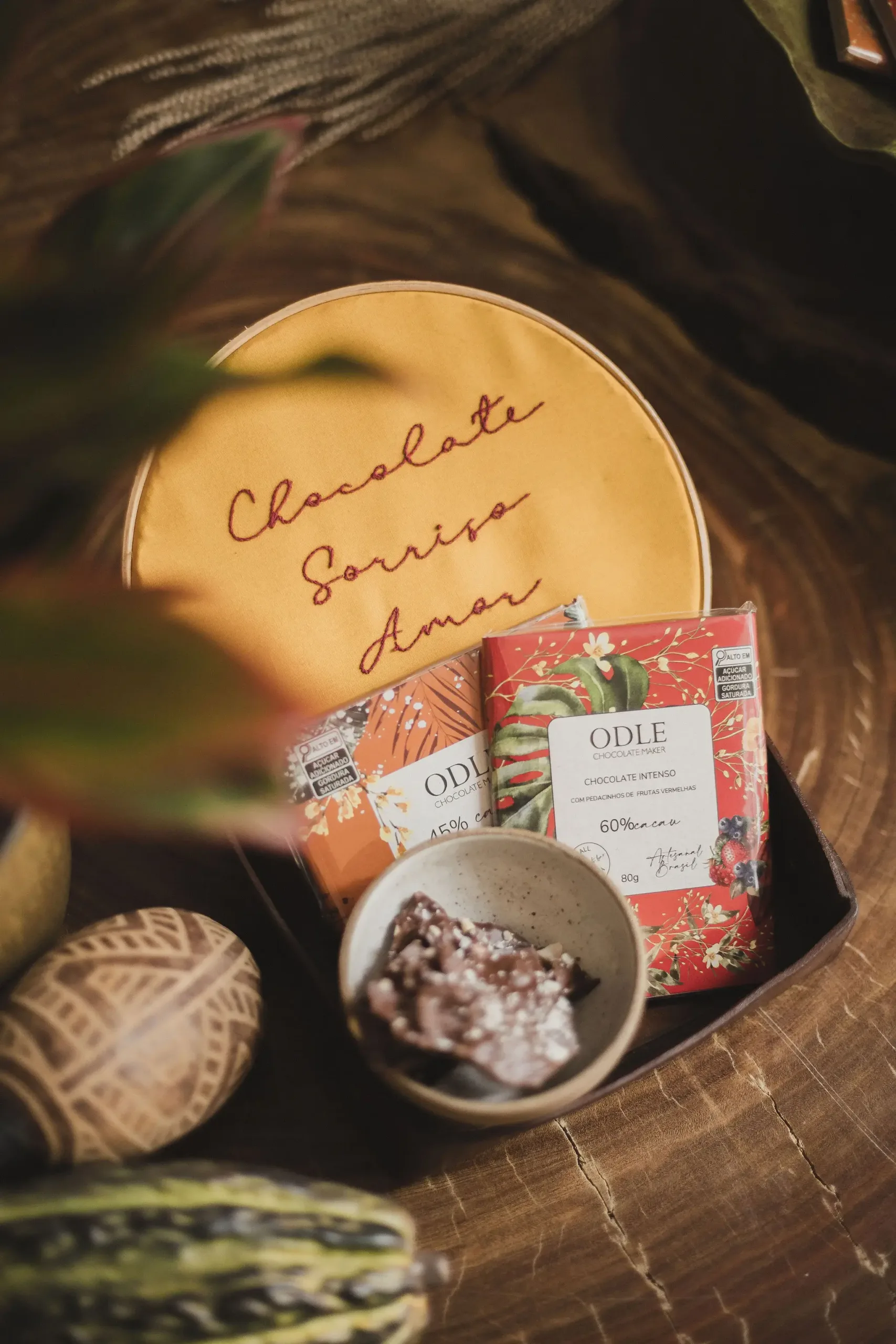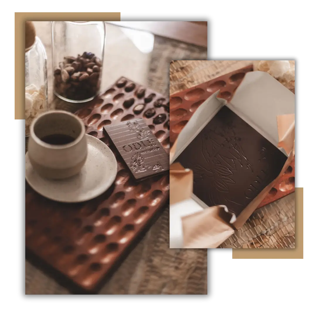 A essência da ODLE vem do universo sensível e afetivo da produção de chocolates bean to bar. Gestos espontâneos, experimentais, texturas e diferentes materiais se combinam com formas delicadas, lúdicas e cores que encantam. O processo de produção artesanal e natural faz com que cada chocolate seja único — um convite à forma livre e viva. É estar e se fazer presente.
